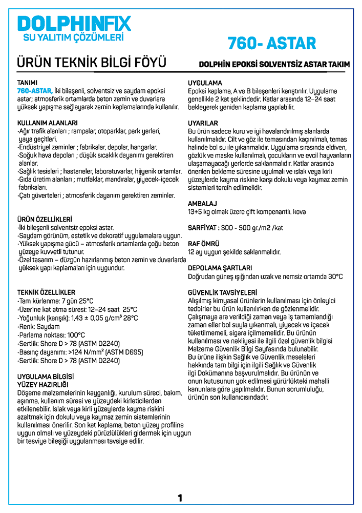 TANIMI: 760-ASTAR, Iki bilesenli, solventsiz ve saydam epoksi astar; atmosferik ortamlarda beton zemin ve duvarlara yüksek yapısma saglayarak zemin kaplamalarında kullanılır.