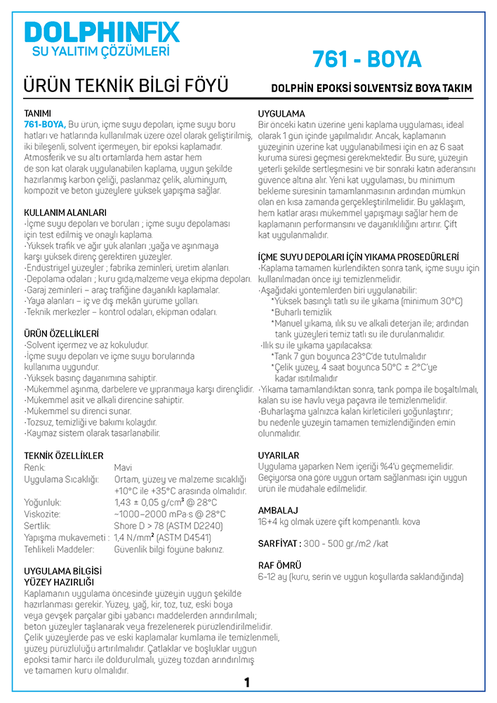 TANIMI: 761-BOYA, Bu ürün, içme suyu depoları, içme suyu boru hatları ve hatlarında kullanılmak üzere özel olarak gelistirilmis, iki bilesenli, solvent içermeyen, bir epoksi kaplamadır. Atmosferik ve su altı ortamlarda hem astar hem de son kat olarak uygulanabilen kaplama, uygun sekilde hazırlanmıs karbon çeliği, paslanmaz çelik, alüminyum, kompozit ve beton yüzeylere yüksek yapışma sağlar.