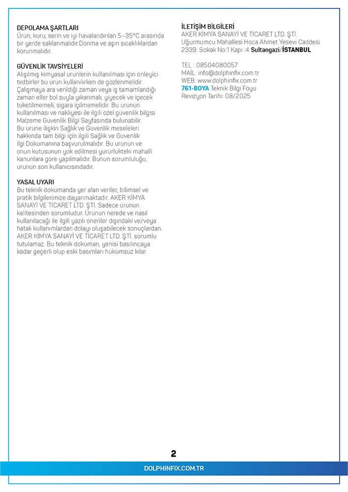 •Uygulama Sıcaklıgı: Ortam, yüzey ve malzeme sıcaklıgı +10°C ile +35°C arasında olmalıdır.