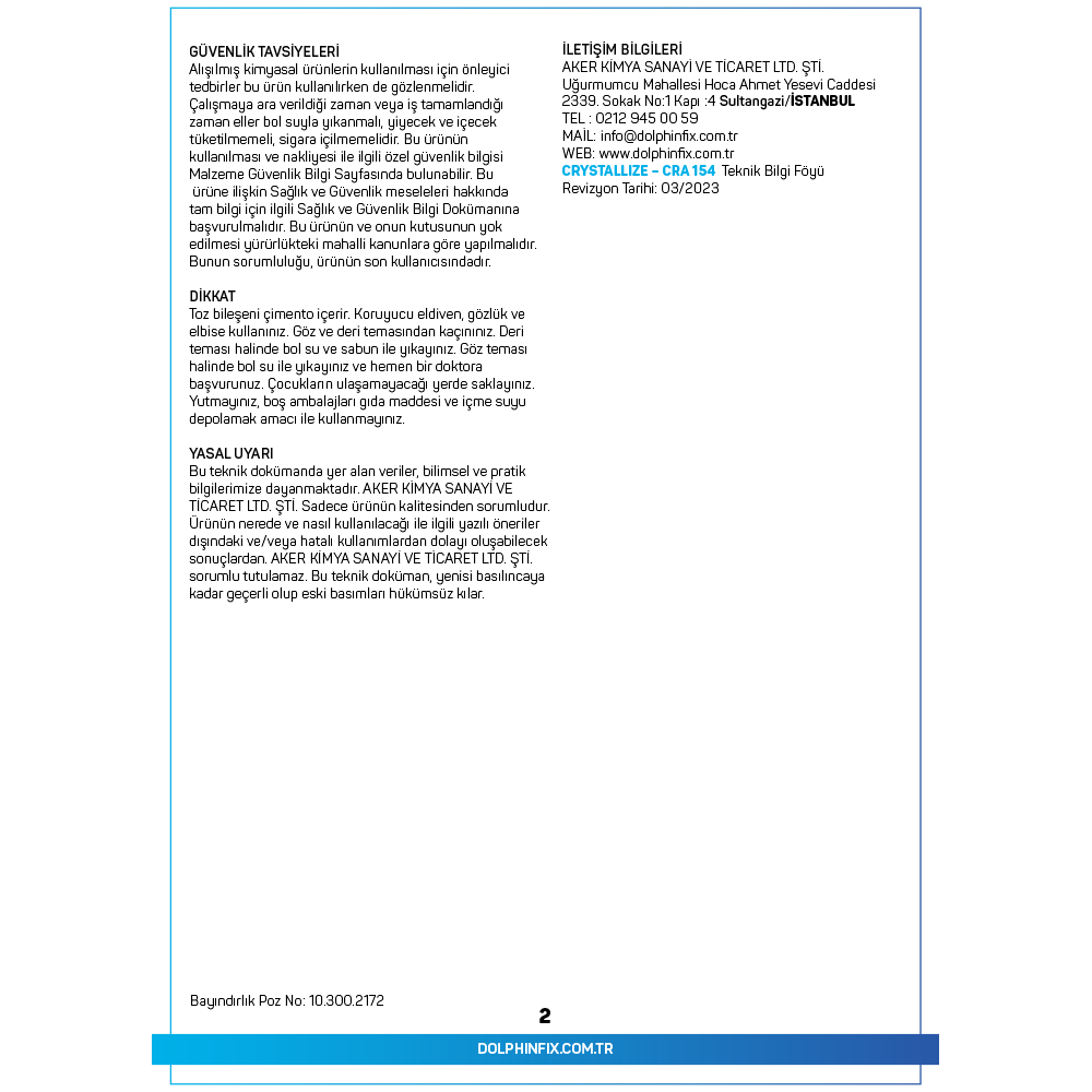 TANIMI : CRYSTALLIZE – CRA 154, çimento ve dogal katkılar kullanılarak gelistirilmis, beton dökülmeden önce zemine serpilerek zeminden gelecek suların betona zarar vermesini engelleyen ve böylece betonu korozyona karsı koruyan kristalize su yalıtımıdır.