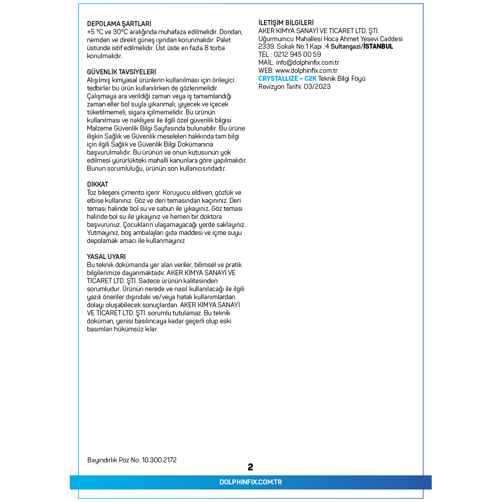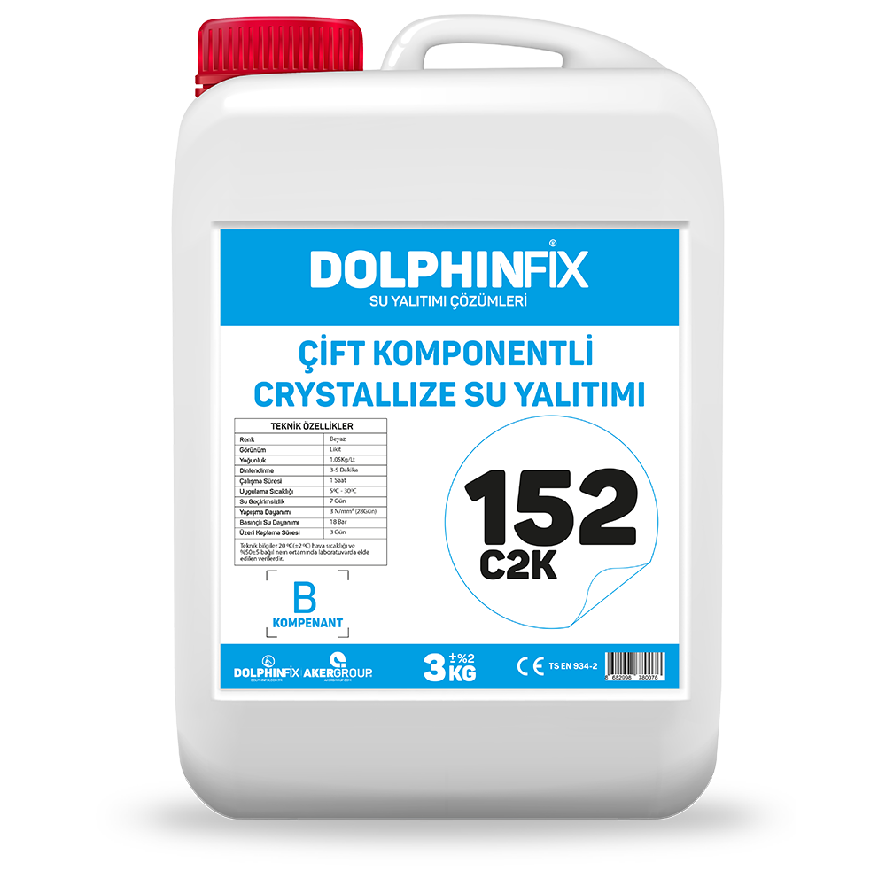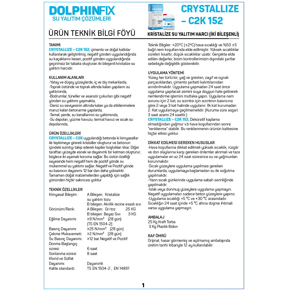 TANIMI : CRYSTALLIZE – C2K 152, çimento ve dogal katkılar kullanılarak gelistirilmis, negatif yönden uygulandıgında su kaçaklarını kesen, pozitif yönden uygulandıgında geçirimsiz bir tabaka olusturan iki bilesenli kristalize su yalıtım harcıdır.