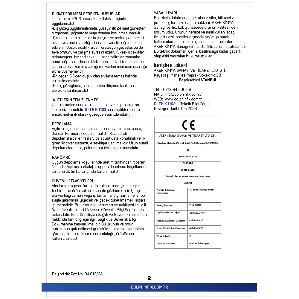 TANIMI: D- TH K 1102, çimento esaslı, hidrolik bağlayıcılı kalın tamir harcı.