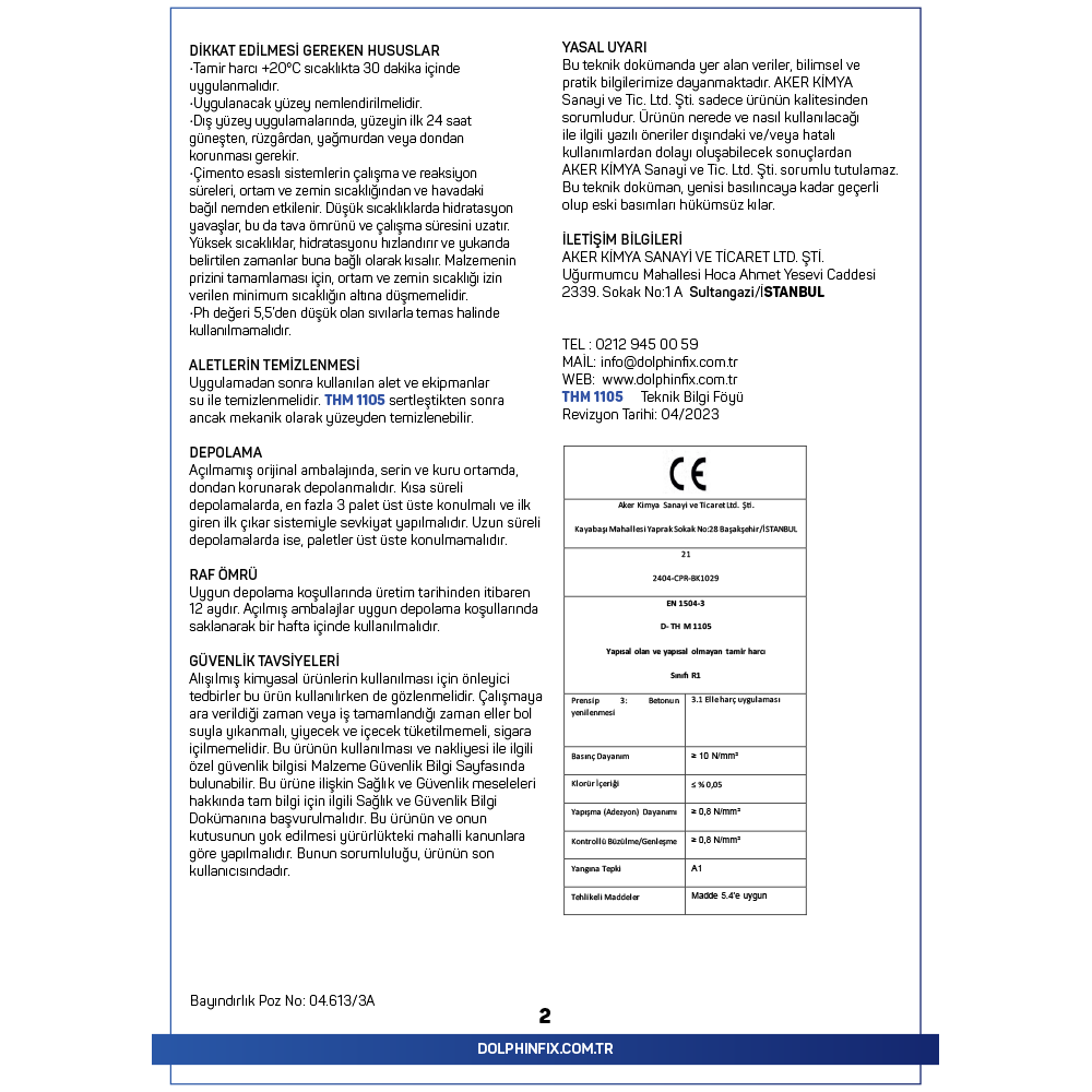 tıkaç ile kapatılmalıdır. Uygulama yüzeyi suya doyurulmalı fakat yüzeyde serbest su kalmamalıdır. Karıştırma Uygun su miktarı, bir ölçek yardımıyla temiz karıştırma kovasına boşaltılır. THM 1105, yavaş yavaş ilave edilerek 400-600 devirli bir karıştırıcı ile homojen ve topaksız bir karışım elde edilinceye kadar 4 dakika karıştırılır. Yaklaşık 4 dakika dinlendirilip tekrar 30 saniye karıştırıldıktan sonra malzeme kullanıma hazır hale gelir.