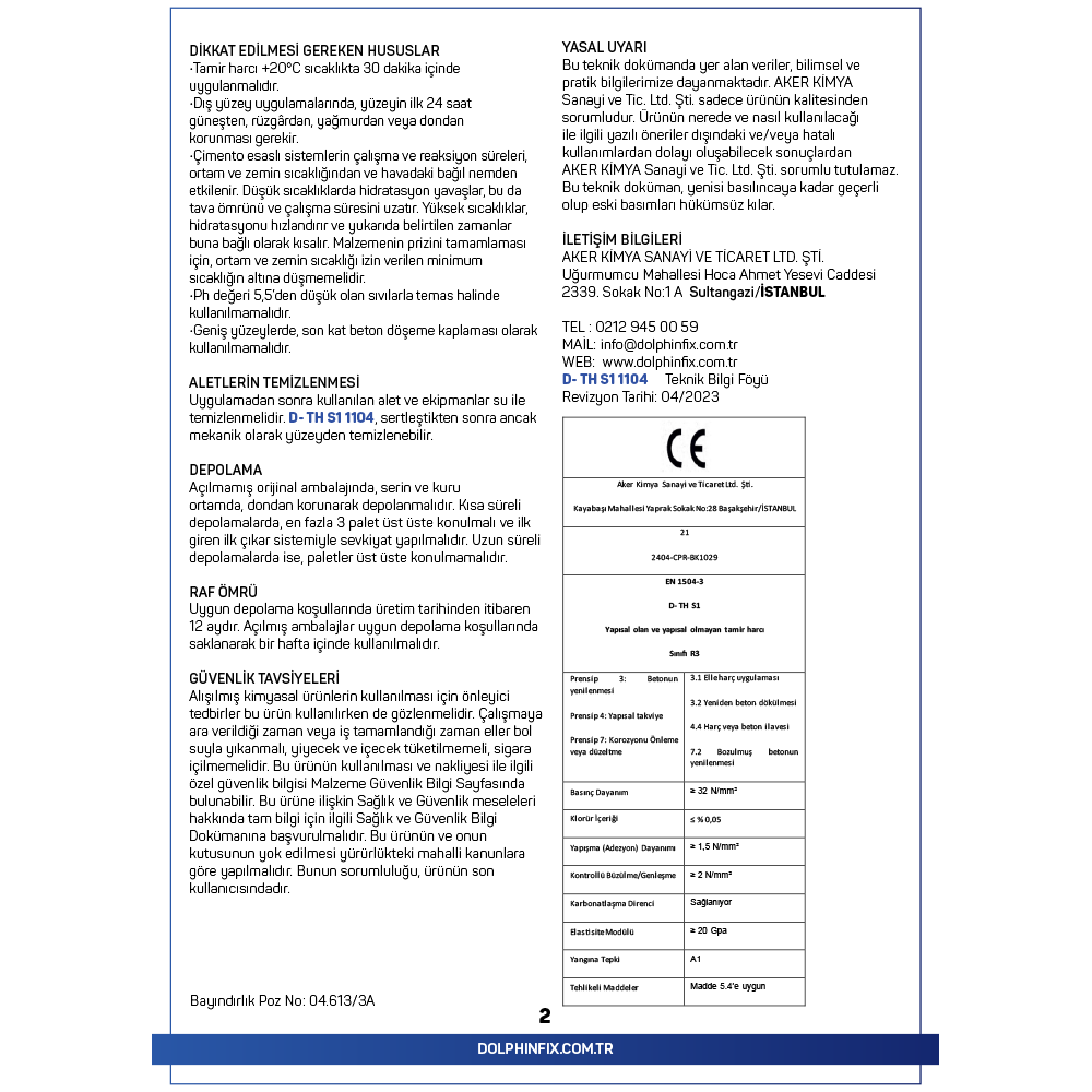 TANIMI: D- TH S1 1104, çimento esaslı, yüksek polimer ve elyaf katkılı, silis dumanlı, performansı artırılmış yapısal ince tamir ve düzeltme harcıdır.