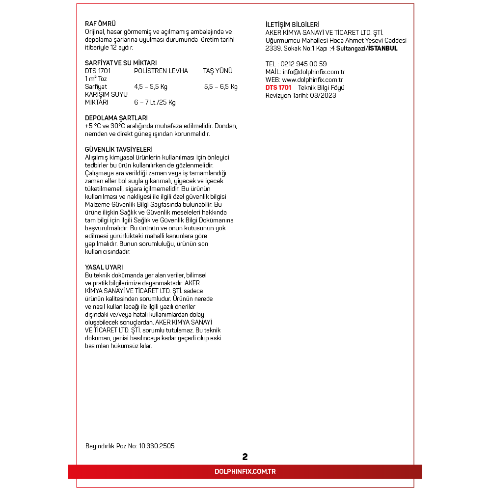 Karıstırma : Temiz bir kovanın içerisine 6 – 7 lt. temiz suyun bir miktarını koyun. Üzerine 25 Kg. DTS 1701’i yavasça bosaltırken karıstırıcı ile düsük devirde karıstırmaya baslayın. Kalan suyu ilave edin harç topaksız ve homojen bir hale gelince 3-4 dk. dinlenmeye bırakın. Daha sonra en az 2 dk. daha karıstırarak kullanın.