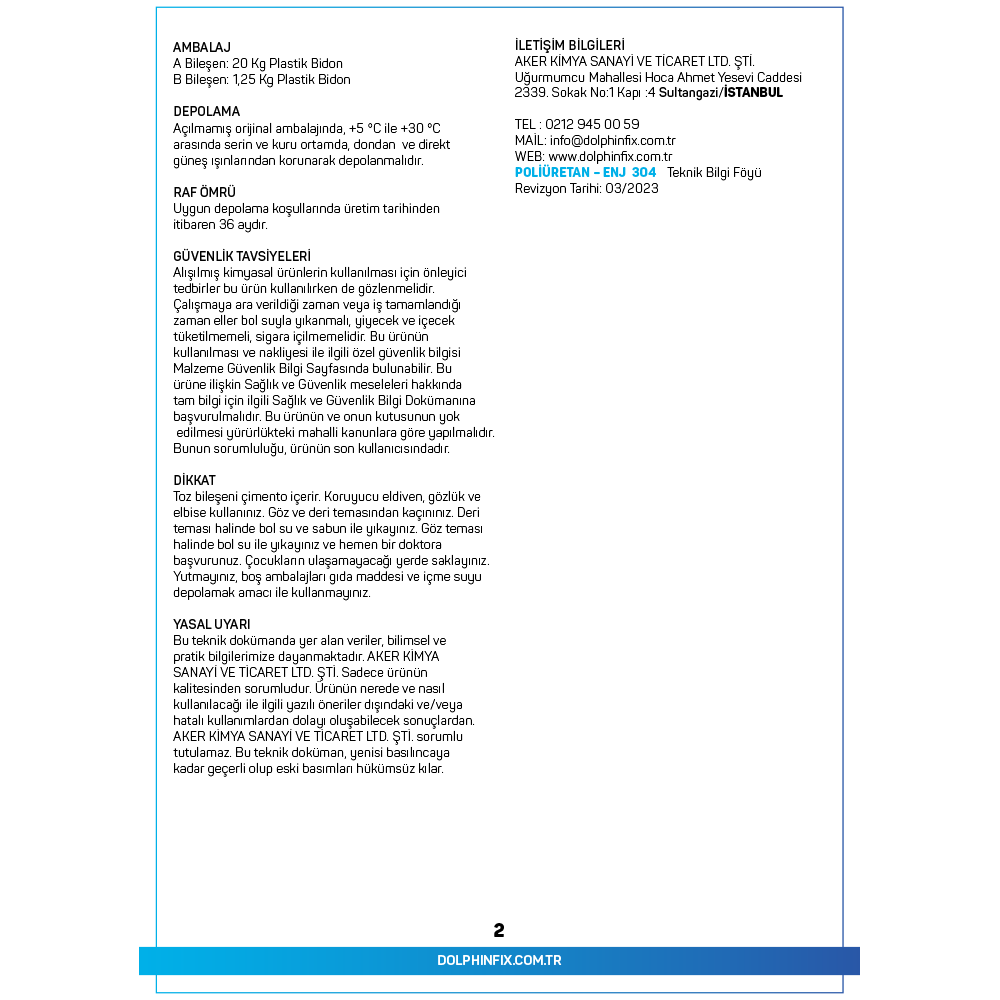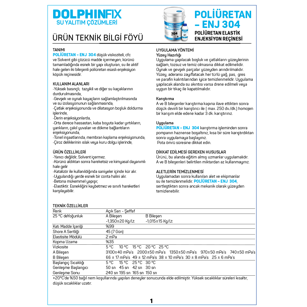 TANIMI : POLIÜRETAN – ENJ 304 düsük viskoziteli, cfc ve Solvent gibi çözücü madde içermeyen, kürünü tamamladıgında esnek bir yapı olusturan, su ile aktif hale gelen iki bilesenli poliüretan esaslı enjeksiyon köpük reçinesidir.