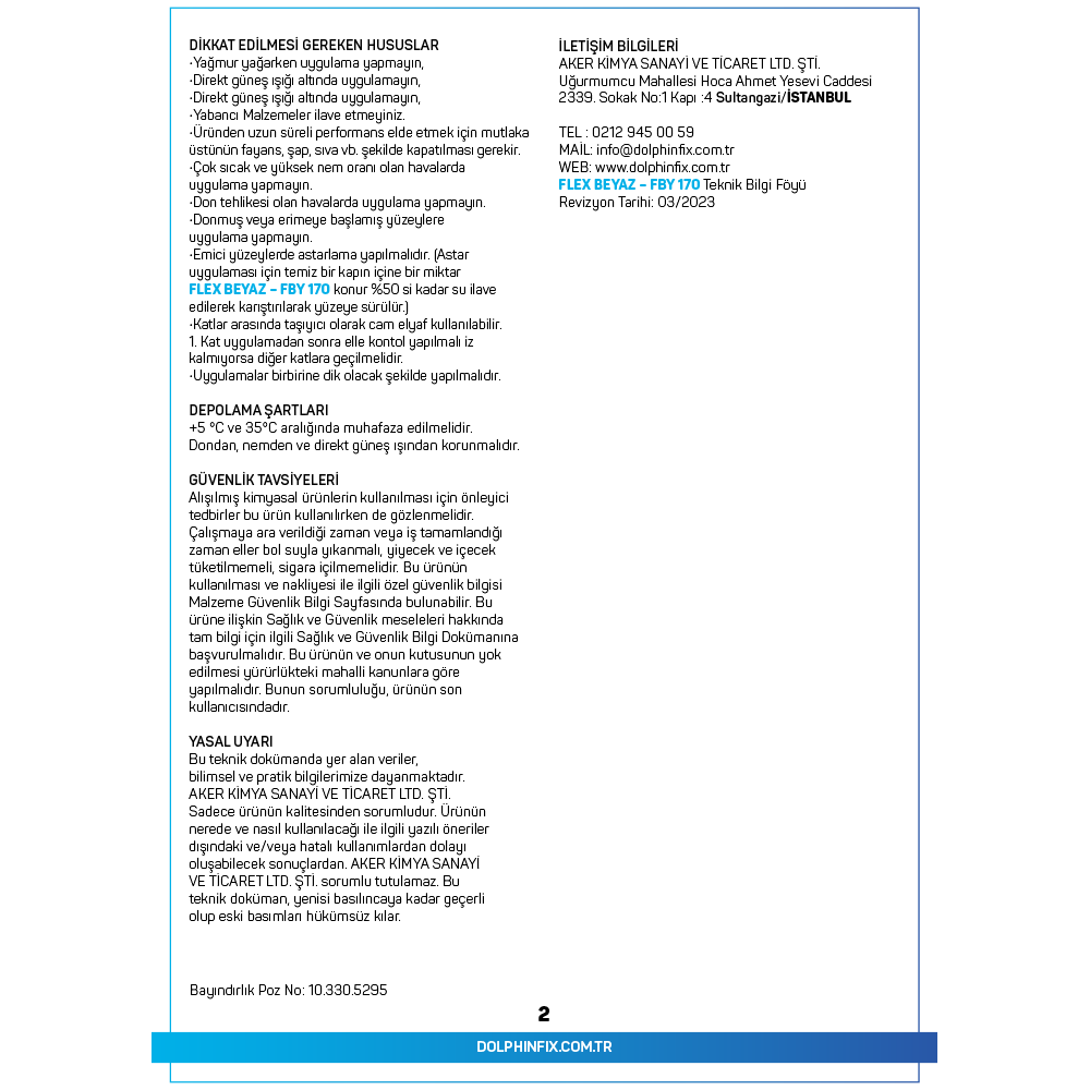 TANIMI : FLEX BEYAZ – FBY 170, elastomerik reçine esaslı, su bazlı, uygulandığı yüzeyde su geçirimsiz elastik bir tabaka olusturan tek bileşenli su yalıtım malzemesidir.