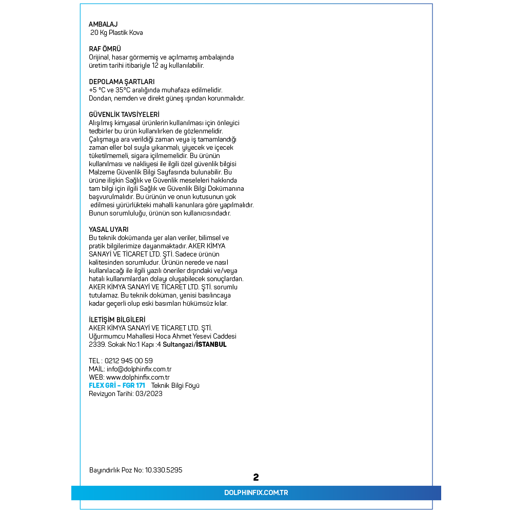 TANIMI : FLEX GRI – FGR 171, Elastomerik reçine esaslı, su bazlı, uygulandıgı yüzeyde su geçirimsiz elastik bir tabaka olusturan tek bilesenli su yalıtım malzemesidir.