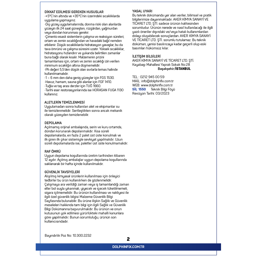 TANIMI: SİL 1550, çimento esaslı, yüksek performanslı, suya karşı yüksek dirençli, silikon katkılı derz dolgu harcı.