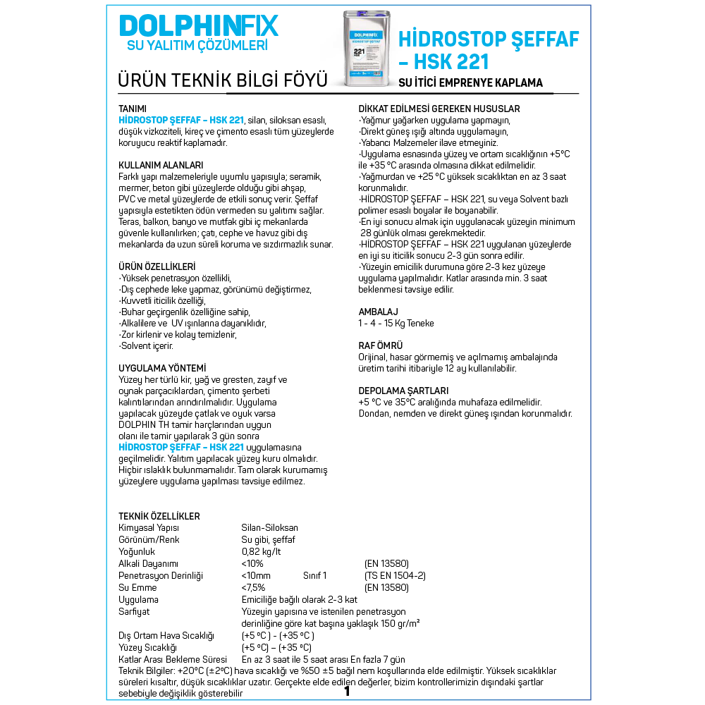TANIMI : HİDROSTOP SEFFAF – HSK 221, silan, siloksan esaslı, düşük viskoziteli, kireç ve çimento esaslı tüm yüzeylerde koruyucu reaktif kaplamadır.