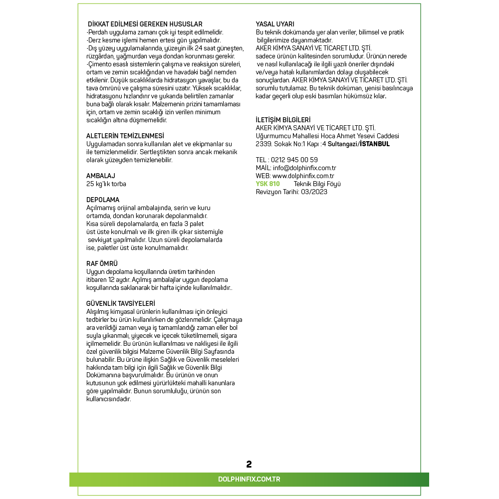 *Tipik değerler: +23°C’de %50 bağıl nem koşullarında 4x4x16 cm harç prizmasında yapılan deneyler sonucunda elde edilmiştir. Yüksek sıcaklıklar süreleri kısaltır, düşük sıcaklıklar uzatır.