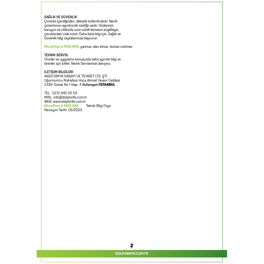 TANIMI: MFA 1002, özel çimentolardan, dolgu malzemelerinden, bağlayıcılardan ve kimyasal katkı malzemelerinden oluşan, elle veya pompa ile uygulanabilen bir zemin tesviye şapıdır. Tek katta 3-30 mm kalınlıkta uygulanmak üzere geliştirilmiştir. Süper plastifiyanlar içeren yeni nesil çevre dostu ürünlerdir.