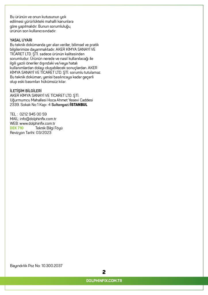 TANIMI : DEK 710, Akrilik emülsiyon esaslı üstün yapısma kabiliyetine sahip tek bilesenli dekoratif sıva altı ve çok amaçlı kullanılabilen astar ajanıdır.